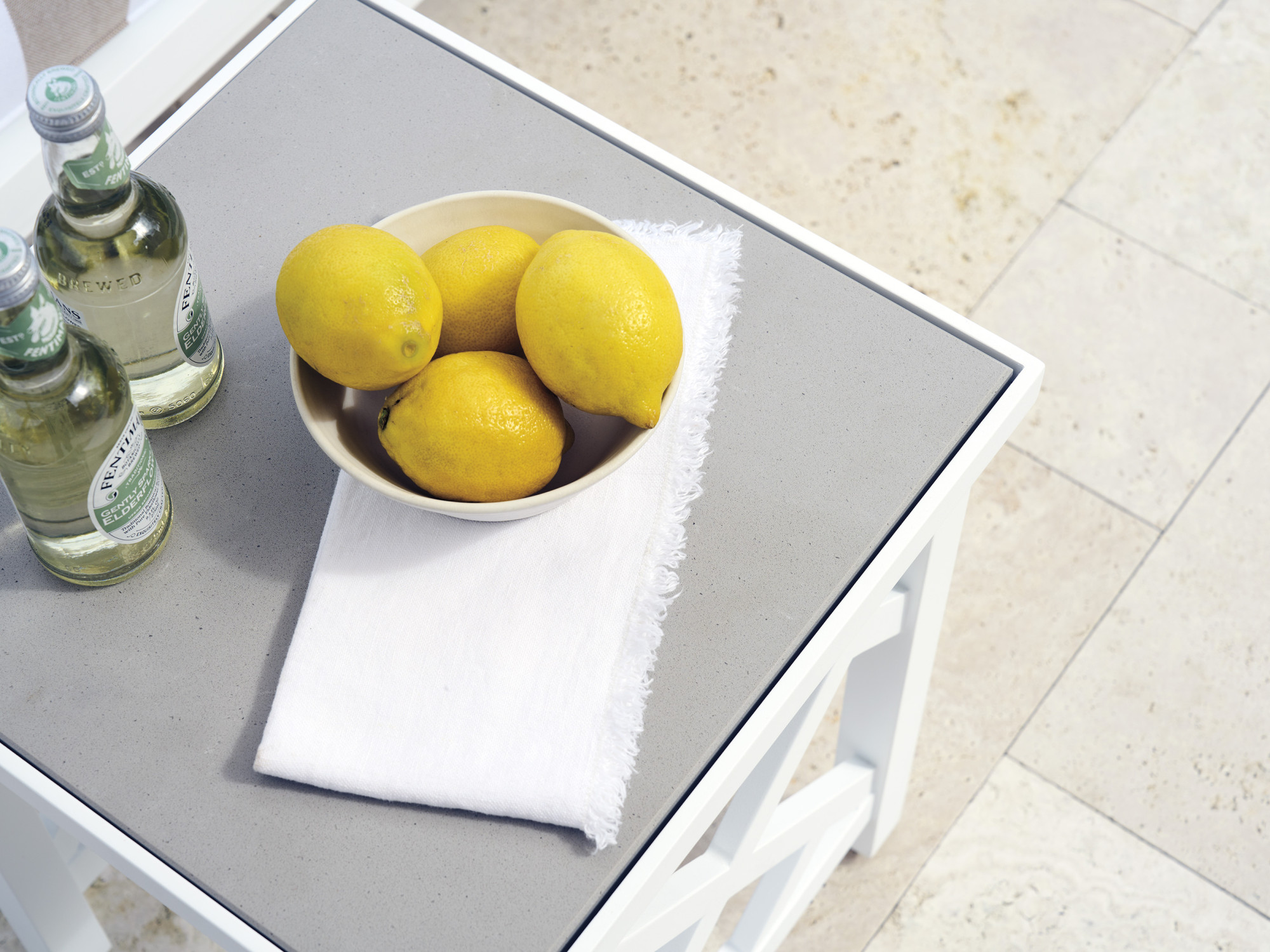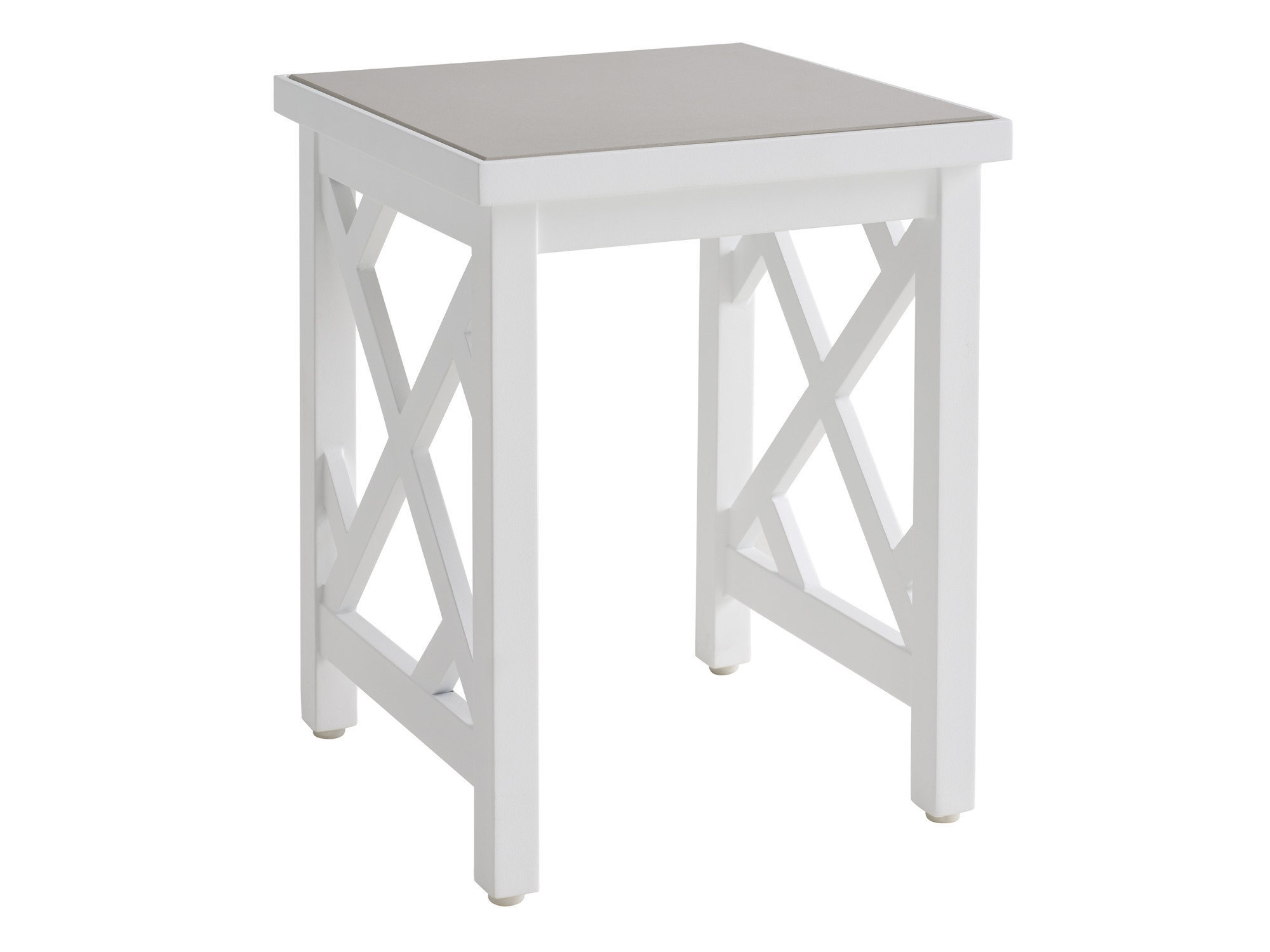 The 17-inch square accent table with quartz top features Chippendale-inspired fretwork on two sides, with the other two sides being open. The table is designed to function as a free-standing chairside table, or to nest beneath the larger square end table.