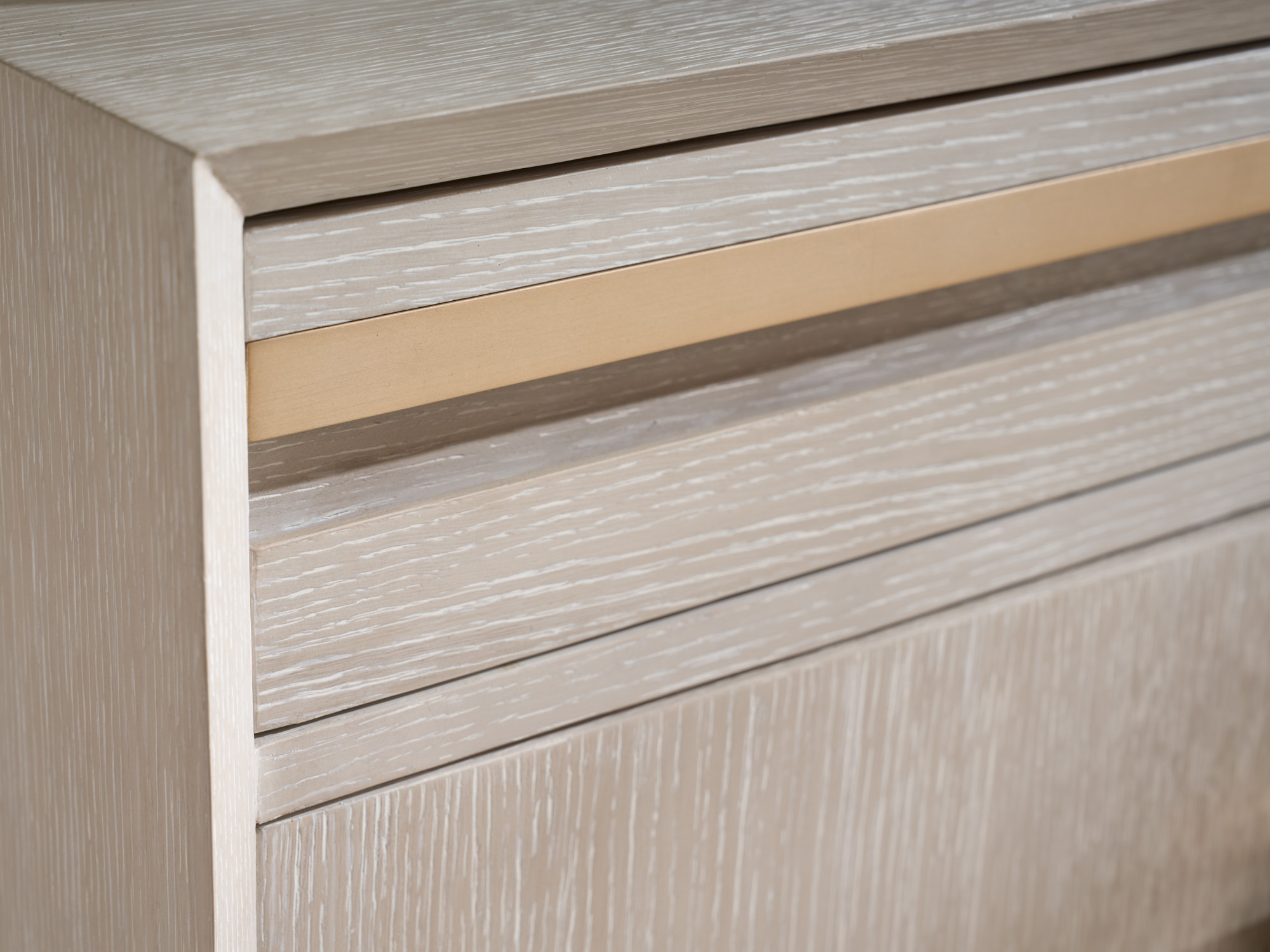 The 72-inch media console features four soft close drawers across the top and four doors beneath, with statement hardware in a champagne finish. Behind each pair of doors is one adjustable shelf. This design functions equally well as an office credenza. A recessed plinth base gives the piece a floating appearance. The back panel is ventilated to accommodate electronics.
