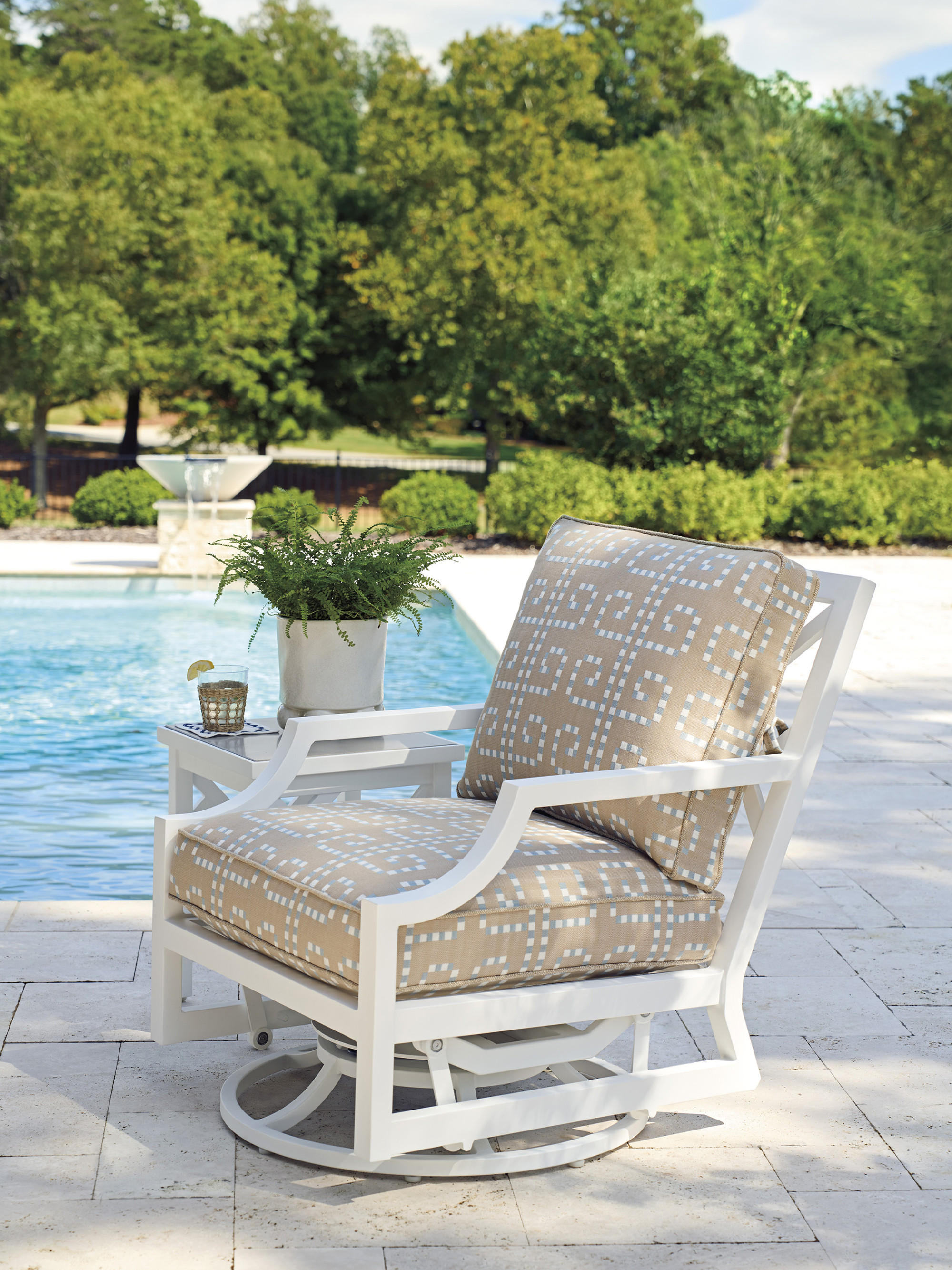 The swivel glider version of the stationary lounge chair delivers a full range of motion. Four chairs surrounding a cocktail table is one of the most popular outdoor configurations. The seat and back cushions are both detachable.
