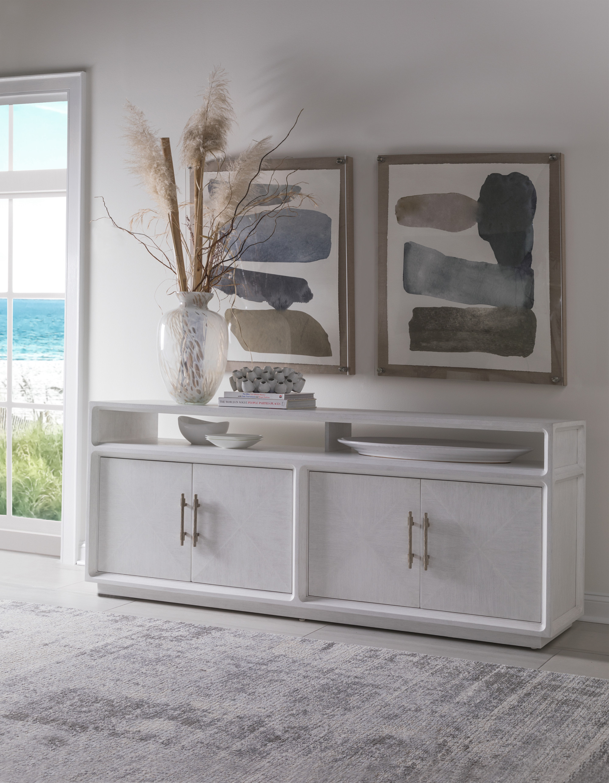 Contemporary desings crafted from mahogany solids and quartered mahogany veneers, finished in Inverno, a wire-brushed Arctic white finish with a touch of gray in the grain. Four doors, four adjustable shelves and custom hardware in an antique champagne finish. The console is ventilated with a removable back panel for electronics.