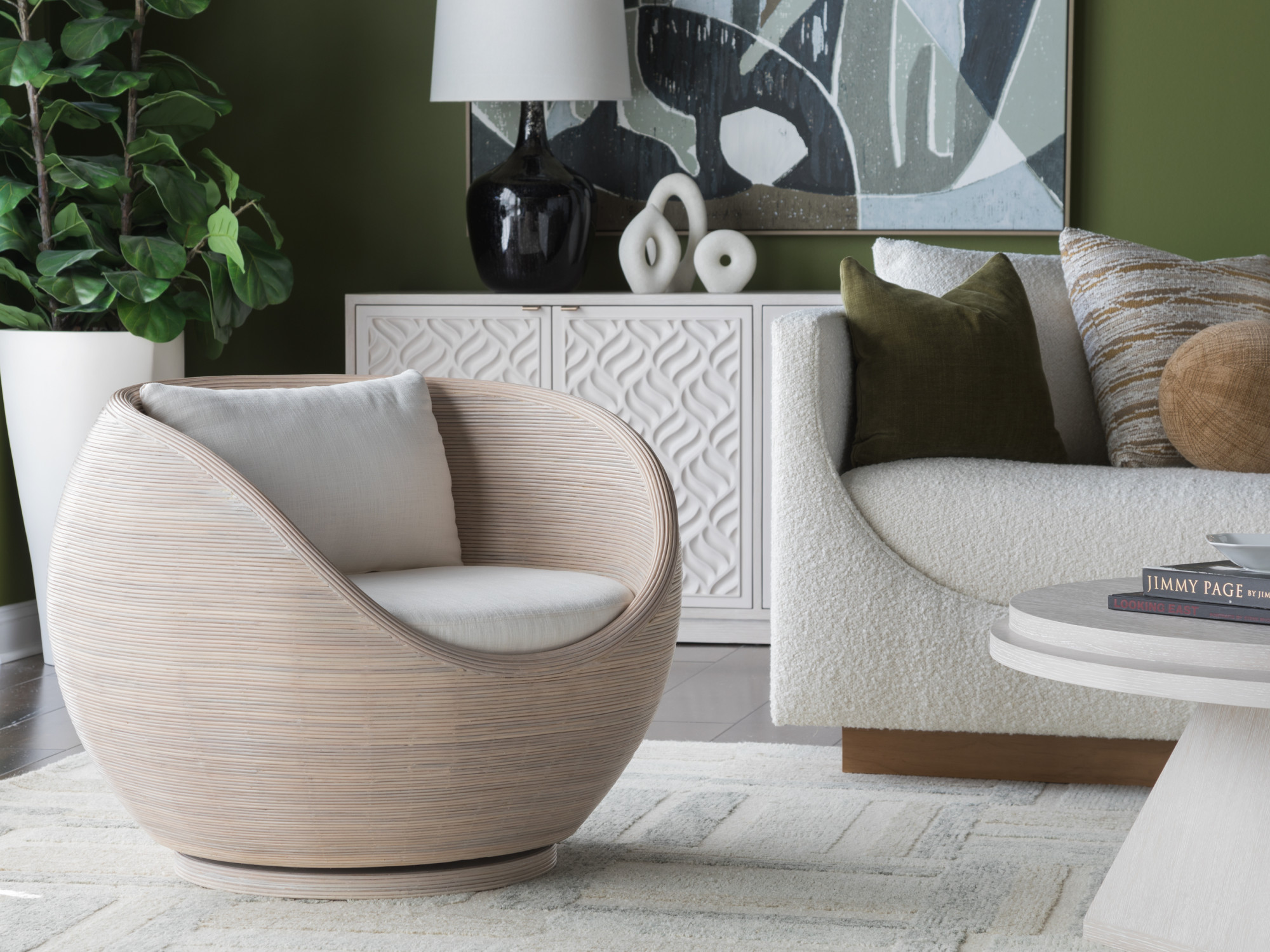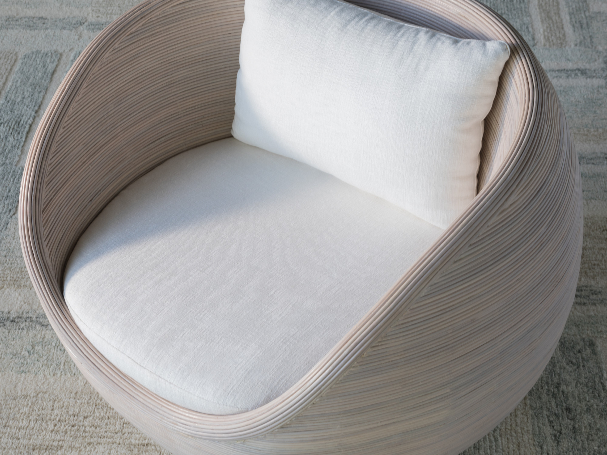 This 1960? antique reproduction is a period-perfect represenation of Solimar? vibe, featuring an orb silhouette wrapped in pencil rattan with a white wash finish revealing natural variation in the organic material. Standard in SmartCare fabric 2292-11, a tightly woven chenille construction.