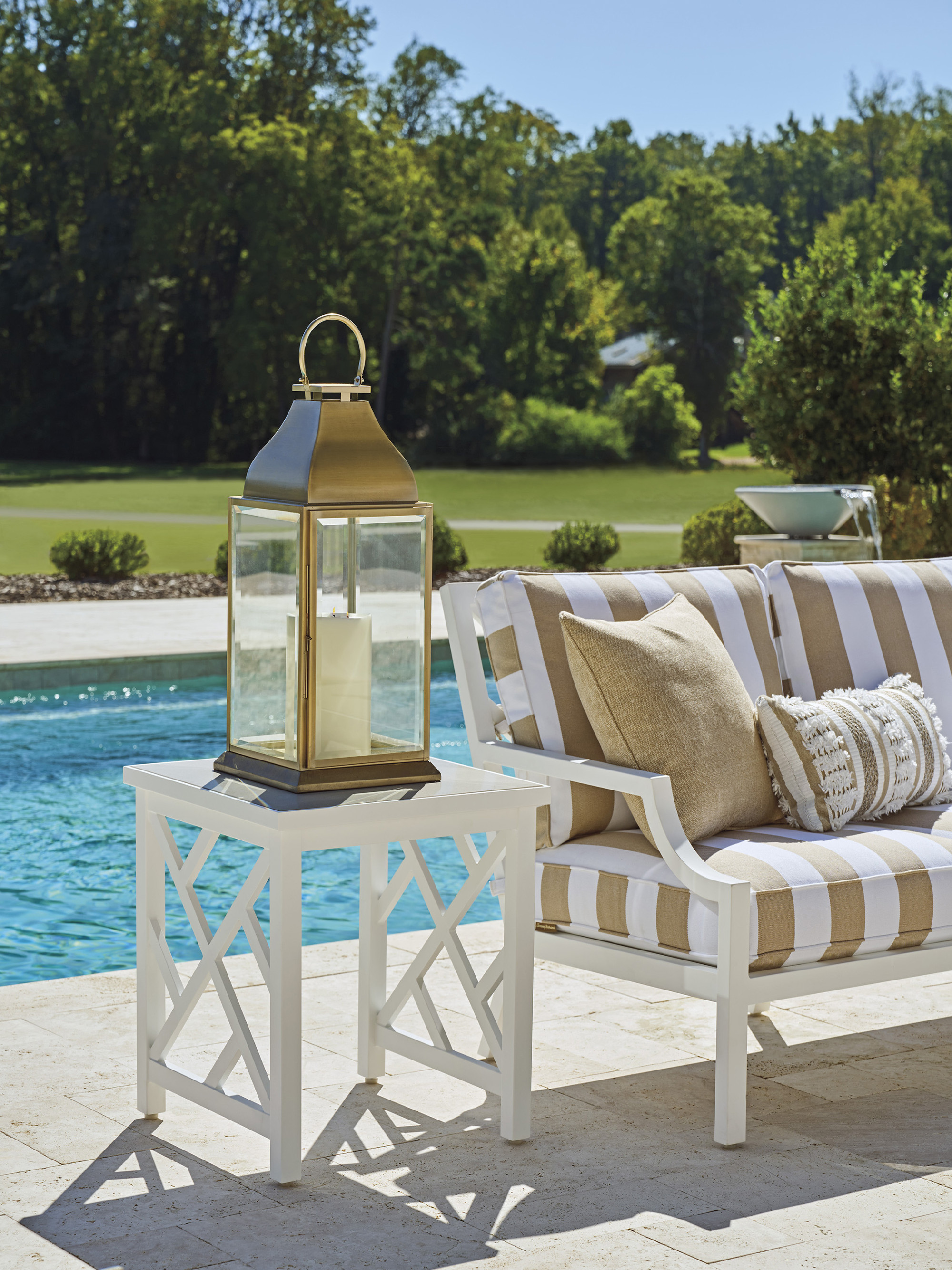 The 22-inch square end table with quartz top features Chippendale-inspired fretwork on two sides, with the other two sides being open. The table functions as a free-standing end table, or can be nested with the accent table.